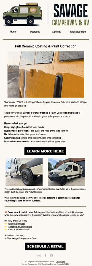 For Savage Campervans and RV, we developed a comprehensive marketing strategy to build their brand presence across multiple channels. We set up and manage their digital advertising campaigns while creating targeted email marketing sequences to nurture leads and convert customers. Our work extends to social media outreach strategy and building out their YouTube channel to showcase their products and connect with the outdoor adventure community. This integrated approach ensures consistent messaging across all touchpoints while driving both brand awareness and direct bookings for their campervan upgrade business.